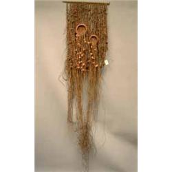 VÄGGSKULPTUR, MARGARETA ENANDER, "RÖTTER" TJÄRAD HAMPA OCH KERAMIKSKÅLAR, H260, B80