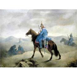 CHRISTIAN II SELL 1854-1925, OLJEMÅLNING, 2 PREUSSISKA GARDESOFFICERARE TILL HÄST FRAMFÖR SÅRAD SOLDAT, 40X52, SIGN.