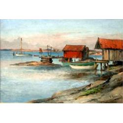 LUDVIG RICHARDE 1862-1929, OLJEMÅLNING, KUSTMOTIV MED BÅTAR OCH HUS, 32X47, SIGN.