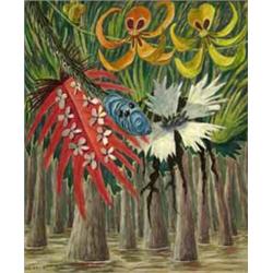 KARL AXEL PERHSON F. 1921, OLJEMÅLNING, "SKVIRR", DJUNGEL FANTASIBLOMMOR, SIGN. 65X53