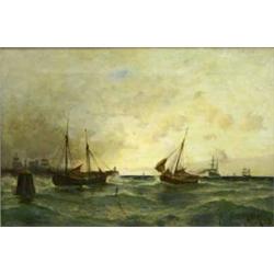 JUSTUS LUNDEGÅRD 1860-1924, OLJEMÅLNING, FISKEBÅTAR VID HAMNINLOPP, HELSINGBORG ? SIGN. 1884, 40X60 (LAGNINGAR)