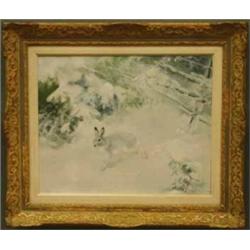 MOSSE STOOPENDAHL 1901-48, OLJEMÅLNING, HARE PÅ NYSNÖ, SIGN. 1947, 40X49
