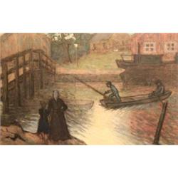 CARL KYLBERG 1878-1952, TILLSKRIVEN, BLANDTEKNIK, FISKE VID BRO MED FIGURER, SIGN. ATERGO, 35X52