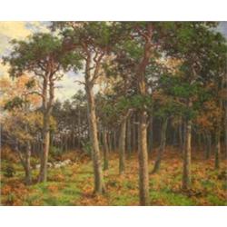 DIXON CLARK C. 1900, OLJEMÅLNING, MAN MED FÅRHJORD I TALLSKOG, SIGN. 102X120