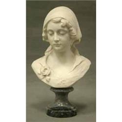 BYST, ALABASTER, KVINNA MED SKUREN ROS, PÅ GRÅFÄRGAD SOCKEL, C. 1900, H38