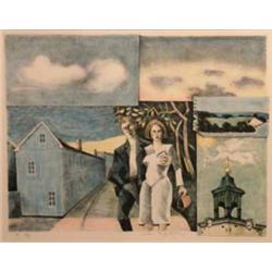 JUSSI TAIPALEENMÄKI F 1948, FÄRGLITOGRAFI, ÄLSKANDE PAR I SURREALISTISKT LANDSKAP, SIGN. 113/190, 41X52
