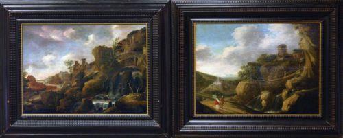 TOBIAS VERHAECHT 1561-1631, HANS ART, OLJEMÅLNINGAR, 1 PAR PANDANGER, LANDSKAP MED TOBIAS OCH ÄNGELN SAMT FLODLANDSKAP MED BÅTAR OCH FIGURER, 46X64 (PANNÅER MED SMÄRRE SPRICKOR)