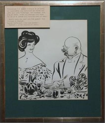ALBERT ENGSTRÖM 1869-1940, TUSCHTECKNING, MAJOR KONVERSERANDE MED BORDSDAM, HISTORIA ATERGO, SIGN. 35X28