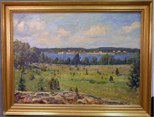 GOTTFRID KALLSTENIUS 1861-1943, OLJEMÅLNING, "BYGDEN", SIGN. 1929, 72X99