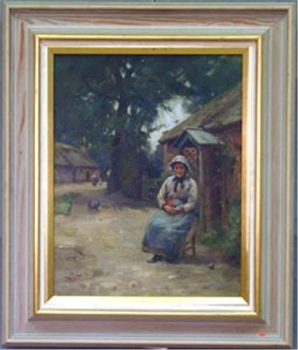 WILLIAM MILLER FRAZER 1864-1961, OLJEMÅLNING, KVINNA UTANFÖR STUGA, SIGN. -97, 45X35
