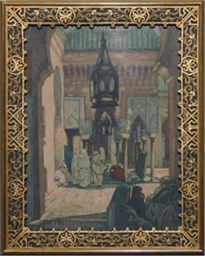OKÄND KONSTNÄR, L RIECHE ? KOLORERAD LITOGRAFI, HAREMSDAMER I PALATS, SIGN. NO 24, SKUREN RELIEFRAM, 60X46