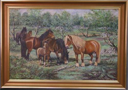 GUNHEIM TORSTENSEN, NORSK, OLJEMÅLNING, HÄSTAR I BJÖRKSKOG, SIGN. 60X89