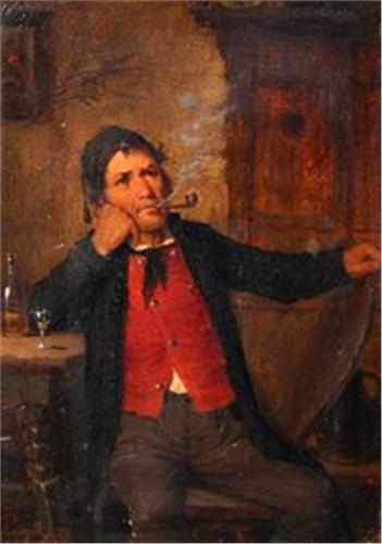 JOSEPH KINZEL 1852-1925, ÖSTERRIKISK, OLJEMÅLNING, PIPRÖKANDE MAN, SIGN. 15X11