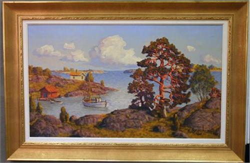 KARL BERGMAN 1891-1965, OLJEMÅLNING, FISKEBÅT I SKÄRGÅRDSVIK, SIGN. 57X96