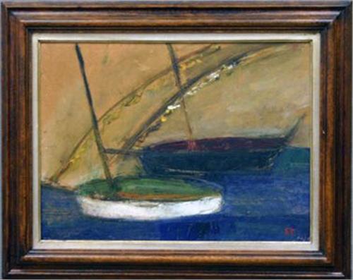BERNT RINGQVIST 1917-66, OLJEMÅLNING, "FISKEBÅTAR", MONOSIGN. 36X49