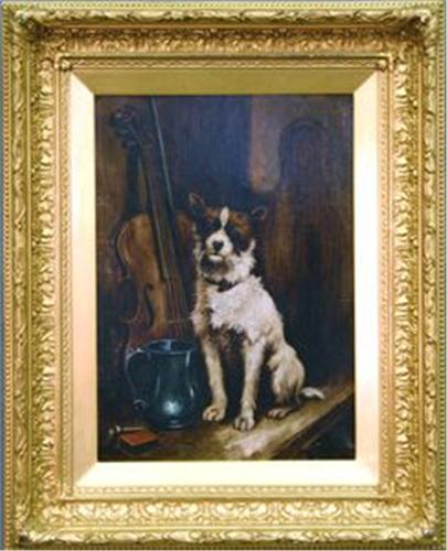OKÄND KONSTNÄR, ANTIK OLJEMÅLNING, HUND VID FIOL, BÄR SIGN. HARDLY, 36X24