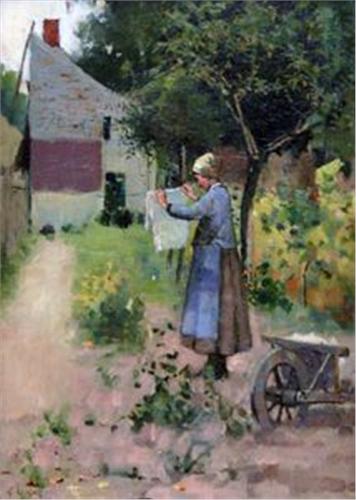 E LAJONE, FRANSK, OLJEMÅLNING, WASHING DAY, BÄR SIGNATUR, 35X25