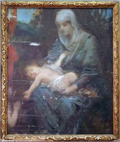 CORREGIO EFTER, ANTIK OLJEMÅLNING, 17/1800-TAL, "MARIA TILLBER BARNET", 1700-TALS RAM, 59X47 (SKADOR)