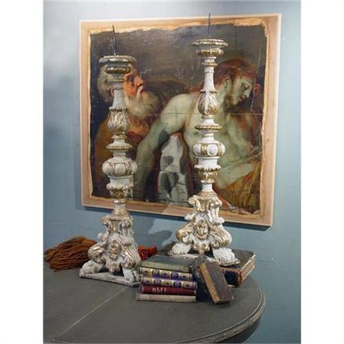 The altar sticks are in very good condition for objects of this age. There are obvious signs of age and wear. The old painted finish has aged and worn, adding to the pieces strong decorative character. Cracks chips and expected signs of use are evident, but nothing that detract from the pair?s appeal.