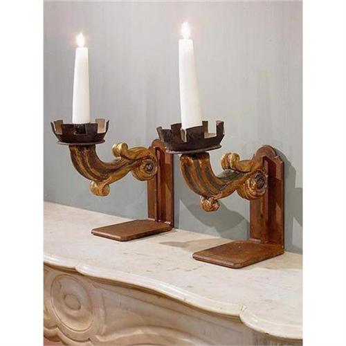 An exceptional pair of 18th C. Spanish candle arms. The pair was discovered in Madrid, Spain. We commissioned a blacksmith to craft modern iron plates. The pair now serves as striking candleholders for use on a table or mantelpiece. These antique sconces are handsomely carved in wood, covered in their original gesso slip and accented with gold gilt. Crenellated tin bobeche complete the decorative look.