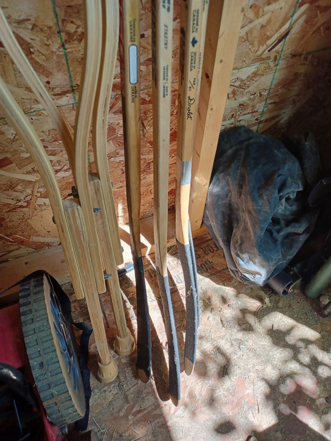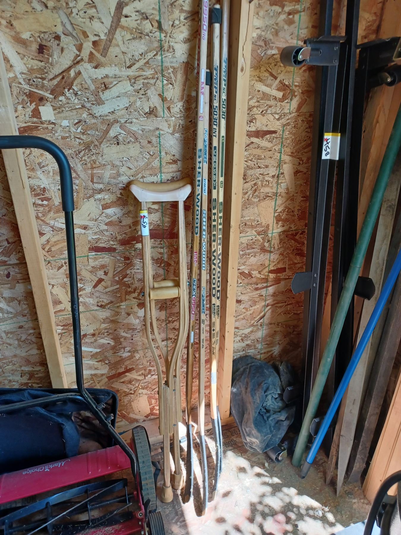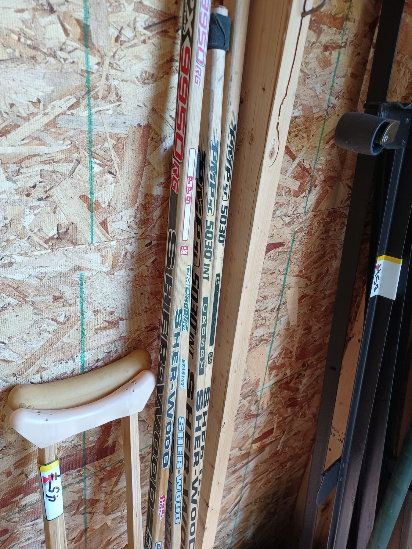 PAIR ADJUSTABLE WOOD CRUTCHES & LEFT HAND - HOCKEY STICKS (X4)