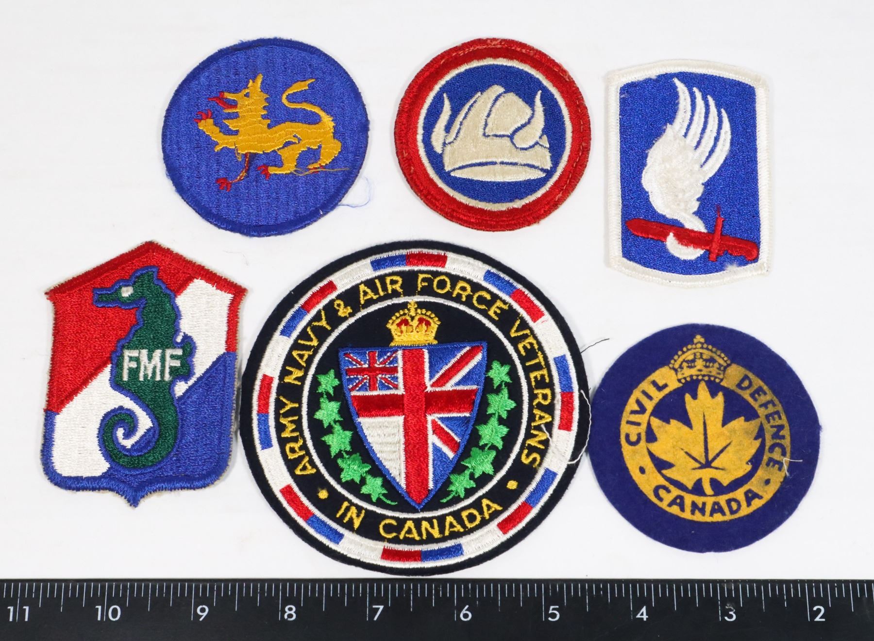 DEFENSE BATTALION SOLD WITH CIVIL DEFENSE CANADA PATCH + VETERANS LARGE CLOTH INSIGNIA AND AMERICAN MILITARY INSIGNIA 47TH DIVISION PATCH