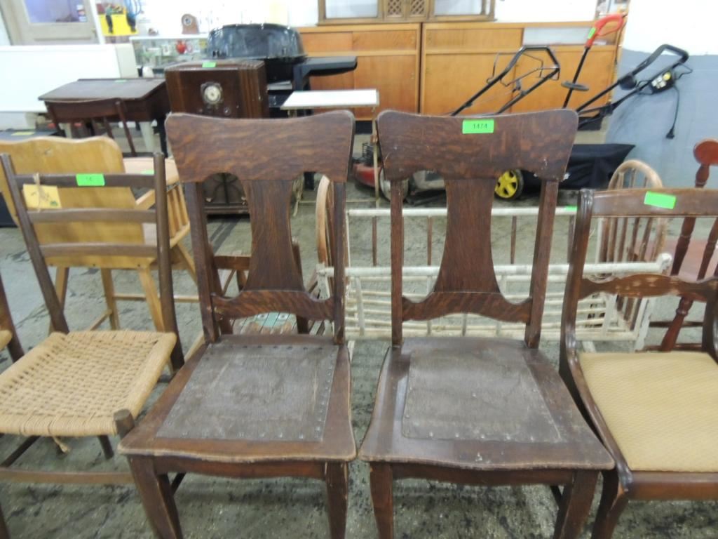 DINING CHAIRS ANTIQUE LEATHER SEAT CREST DESIGN ON LEATHER VINTAGE GOOD CONDITION AS SHOWN SEE PHOTO FOR MORE DETAILS.