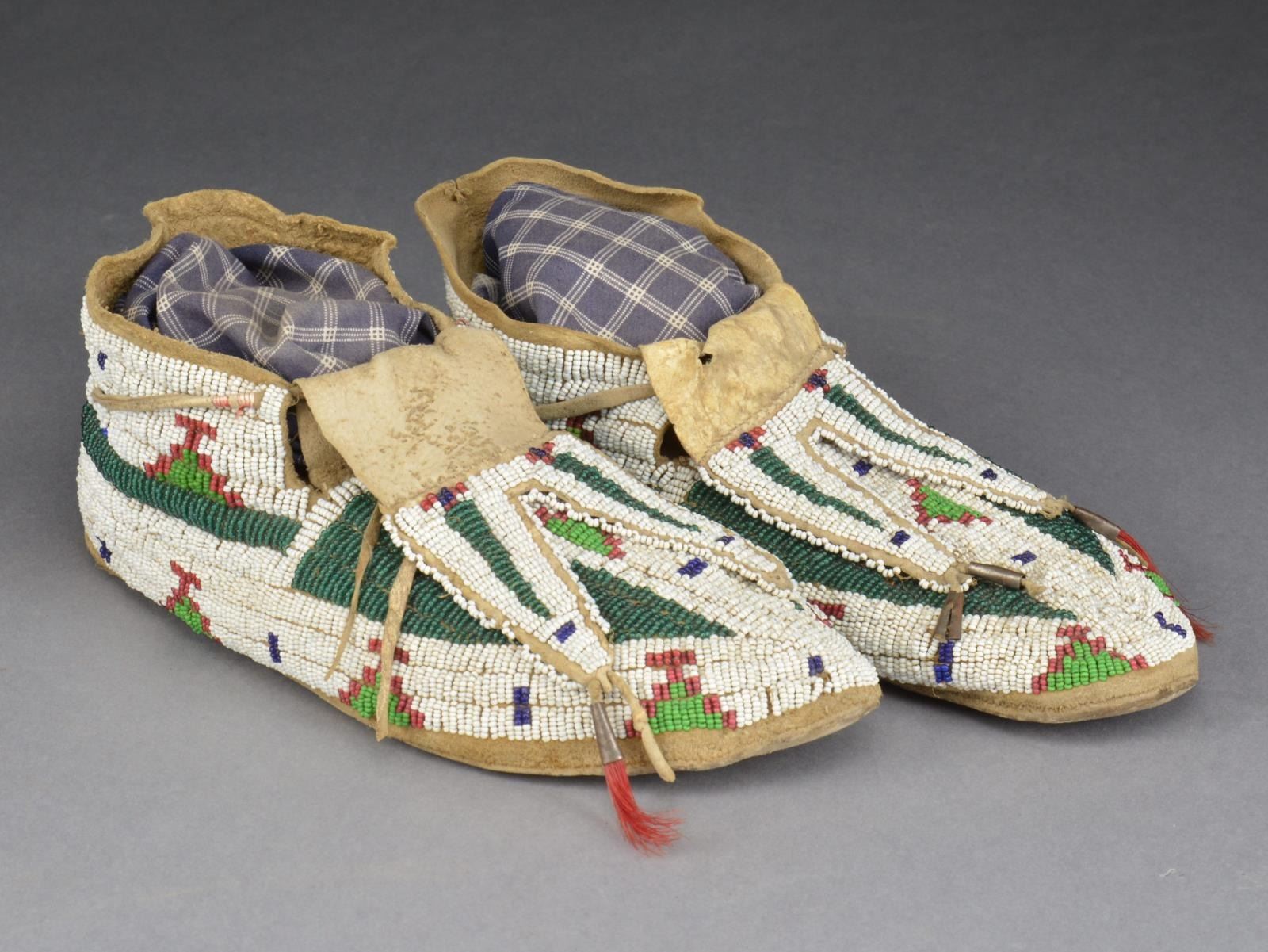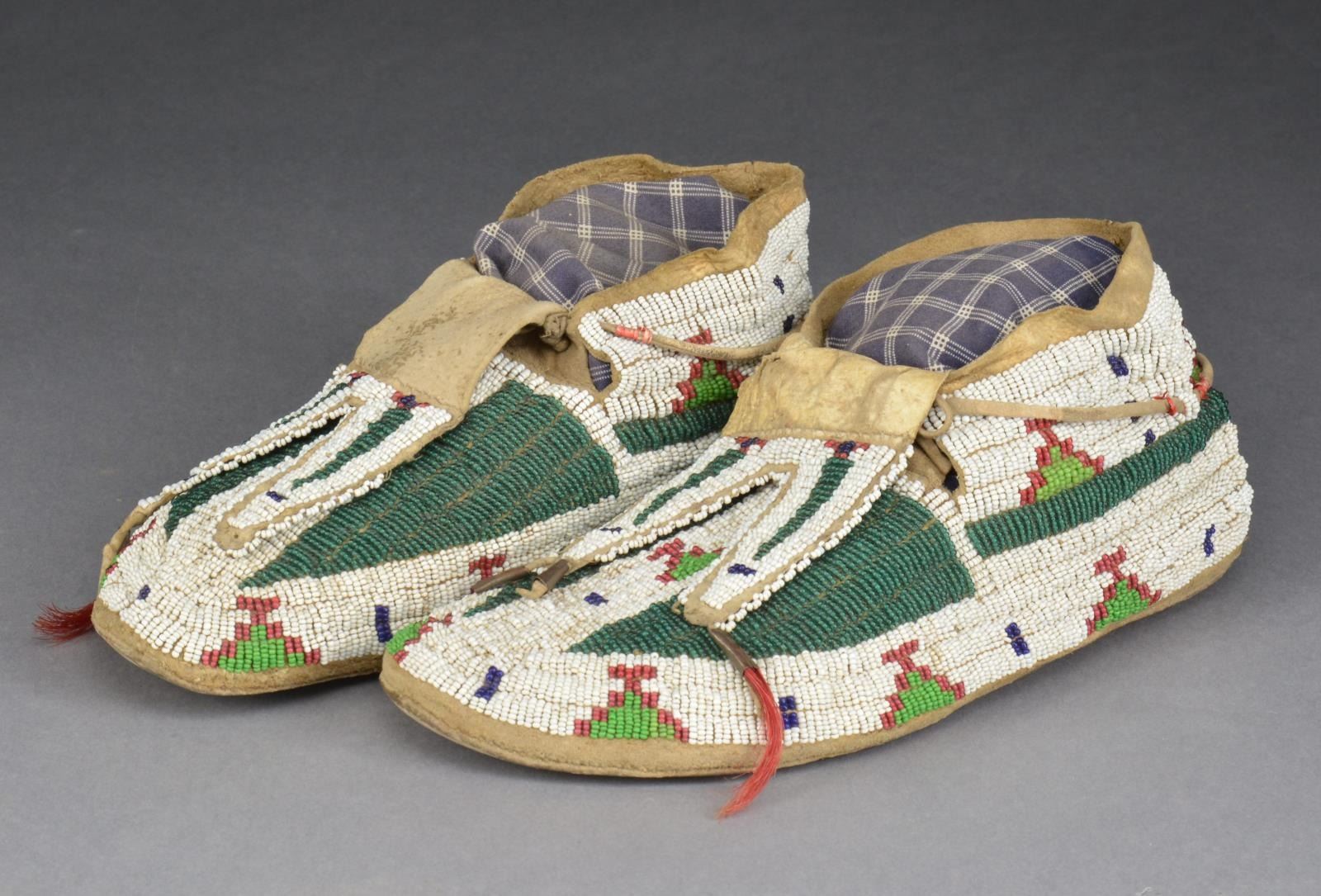 10.5" Length, thread & sinew sewn, white ground w/ green, red, blue geometric design. Bifurcated tongues finished w/ tin cones filled w/ red-dyed horsehair. Late 19th-early 20th century. CONDITION: very good overall, supple, hard sole, missing 4 of 8 tinkle cones. (02-14590/JS). $700-900.