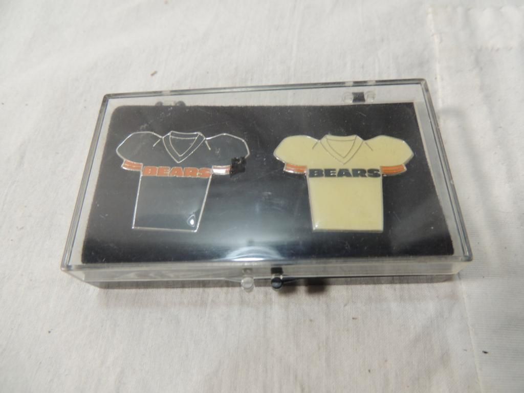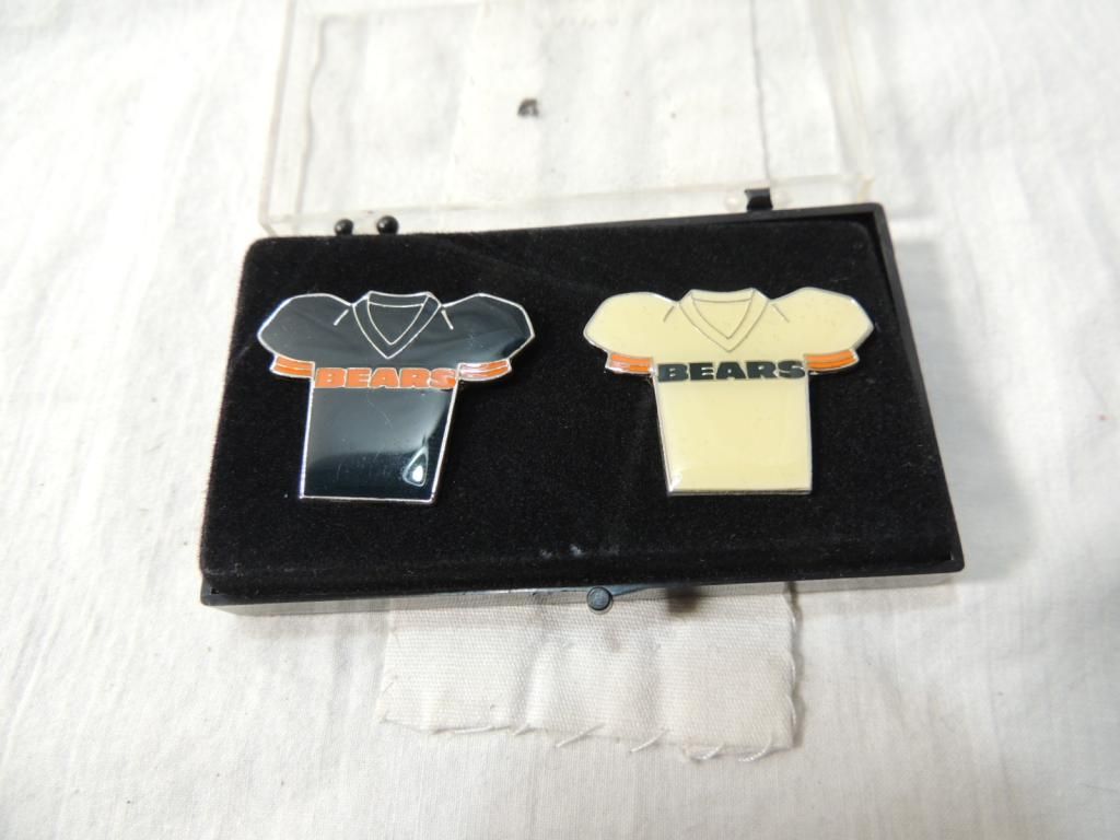 PAIR CHICAGO BEARS JERSEY PINS BLUE AND WHITE. AWAY AND HOME PINS. AS SHOWN. SEE PHOTO FOR MORE DETAILS.