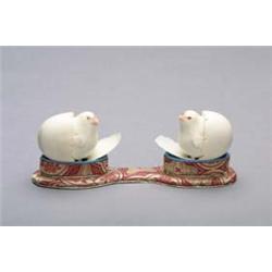 Pair of charming and well-carved, old Chinese ivory models of chicks emerging from their shells (repair to one and minor cracks); both L: 2 3/4", cloth stand