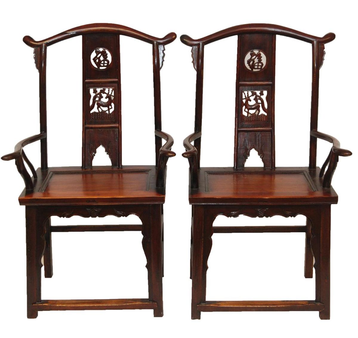A pair of Chinese carved hardwood chairs having reticulated deer and calligraphy design with ox yoke back form. Pair made circa Qing Dynasty period, 18th/19th century. Each measures 47" height x 26" width x 22" depth (119.3cm x 66cm x 55.8cm).