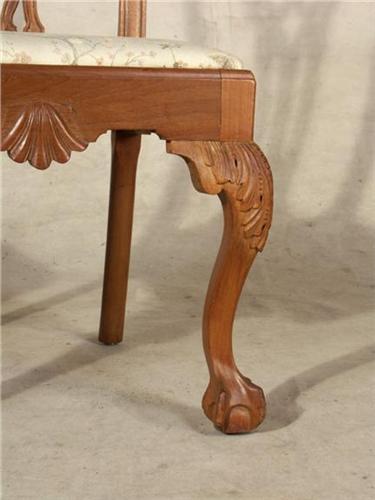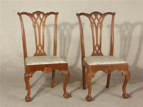 SIDE CHAIRS: Pair Chippendale style walnut side chairs, each with pierced and carved back, carved cabriole legs.