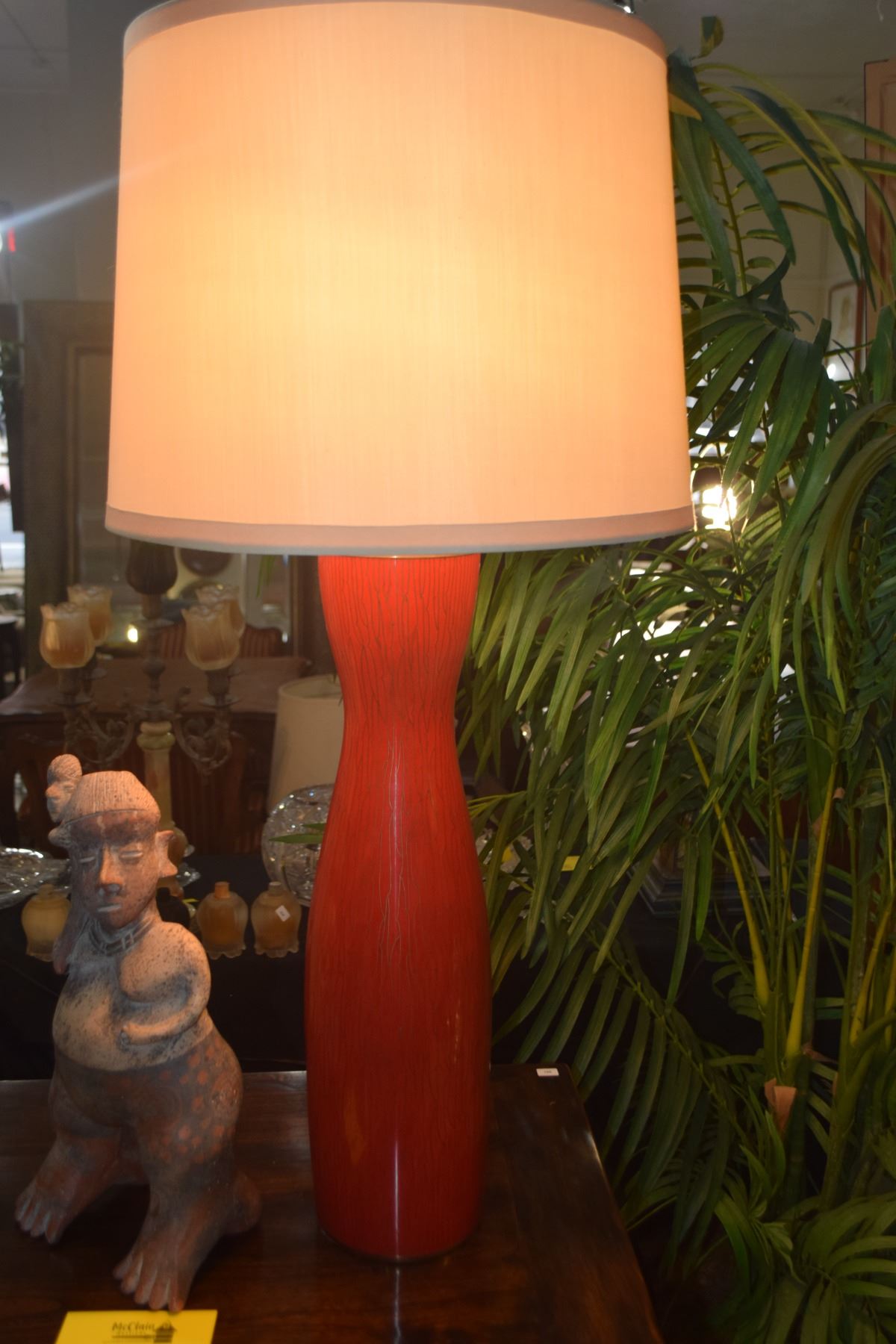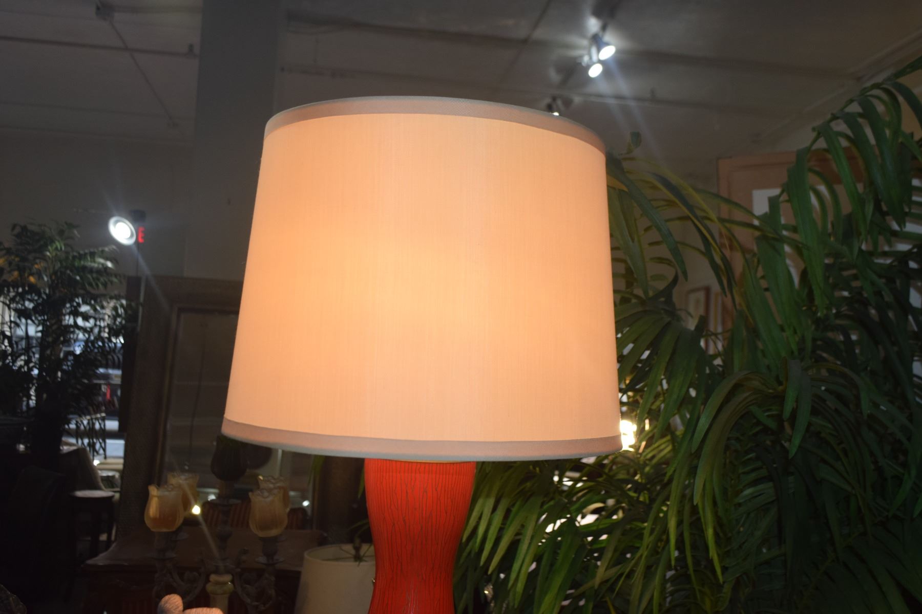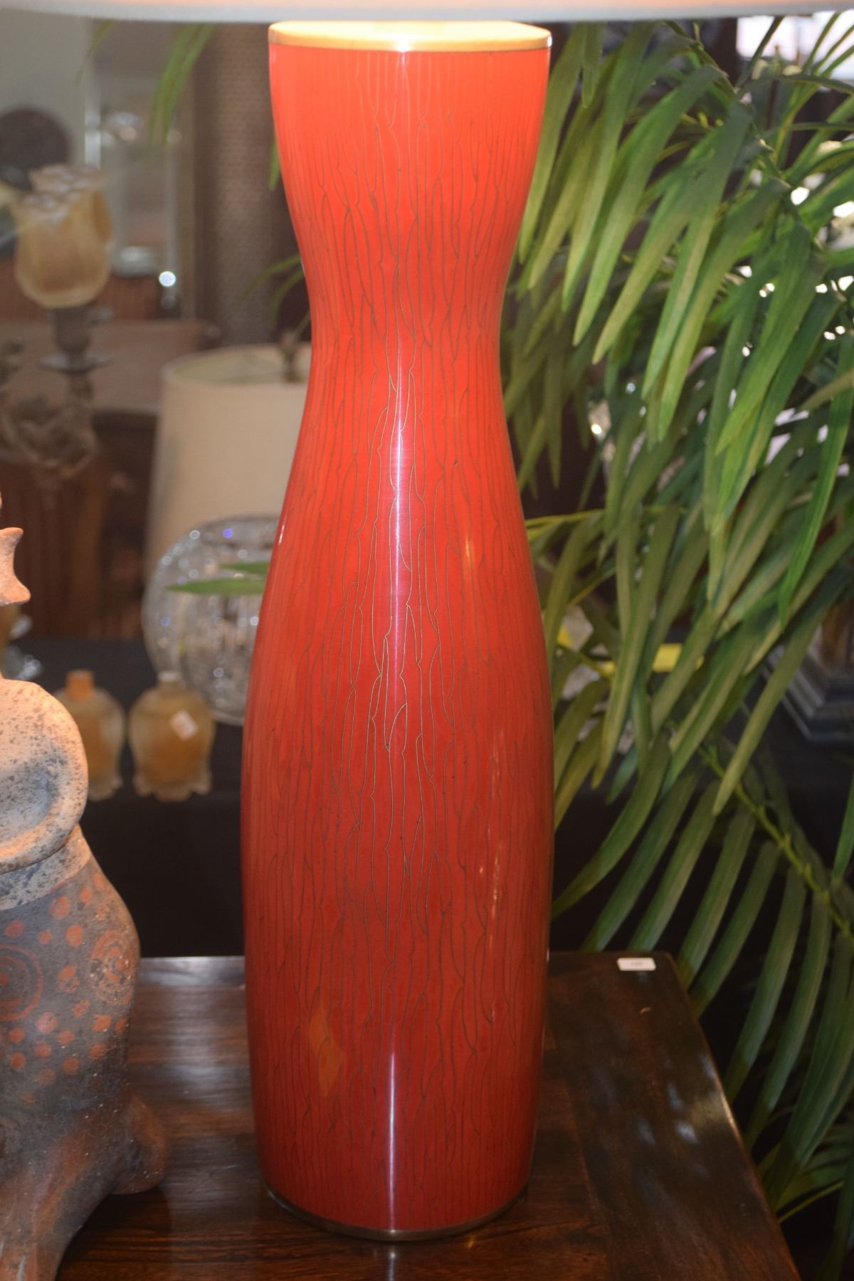 PAIR CINNABAR RED ENAMEL BASE TABLE LAMPS MANUFACTURED FOR STEPHEN E. EARLS, SEATTLE, EACH W/IVORY SILK SHADE (32")