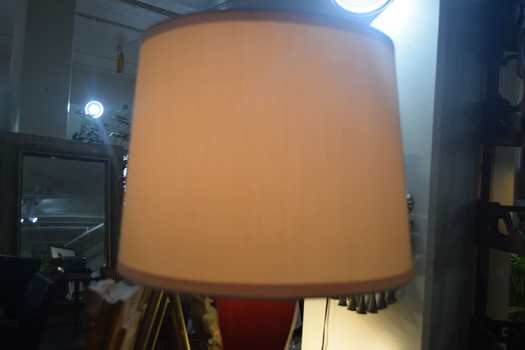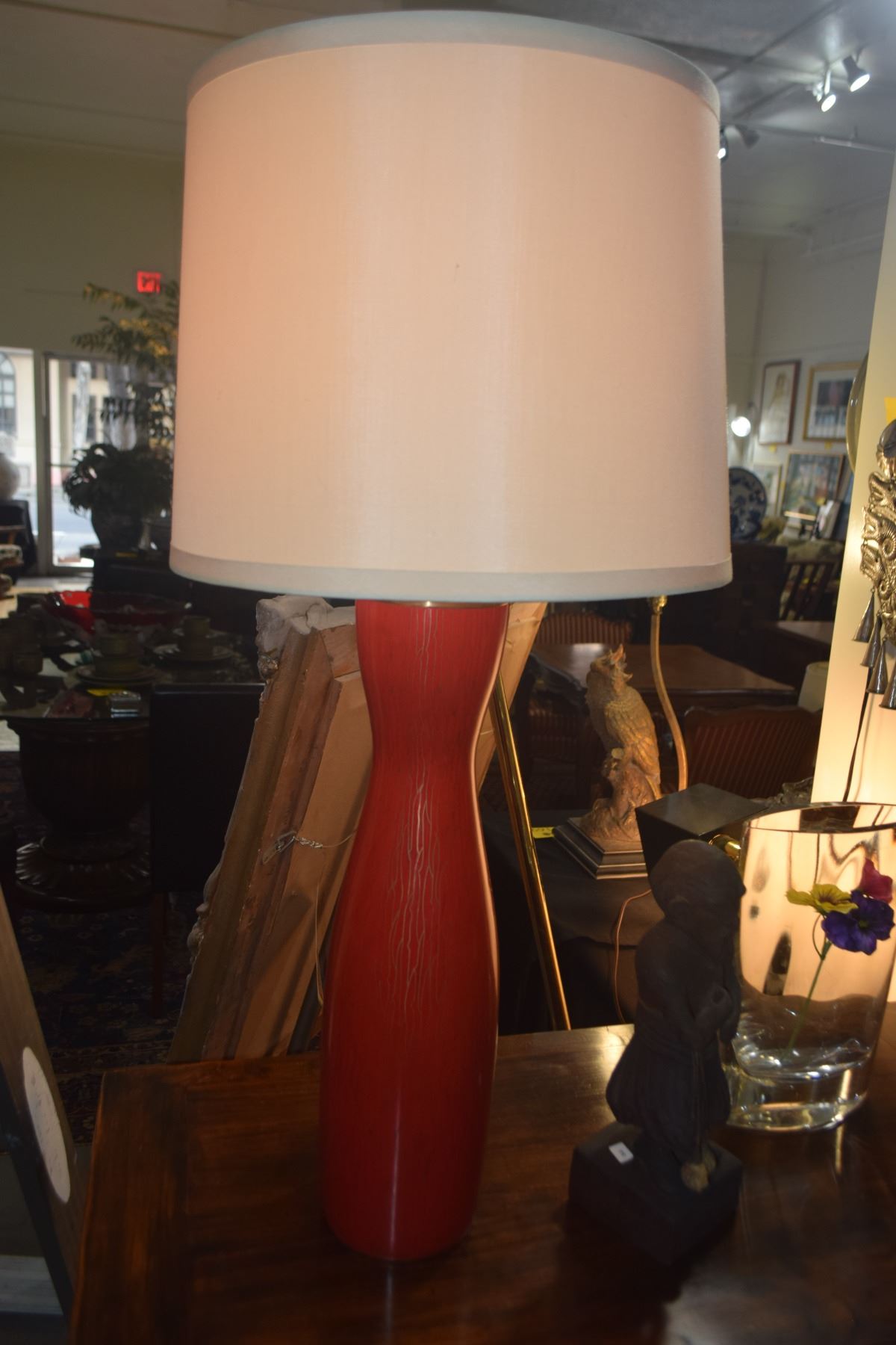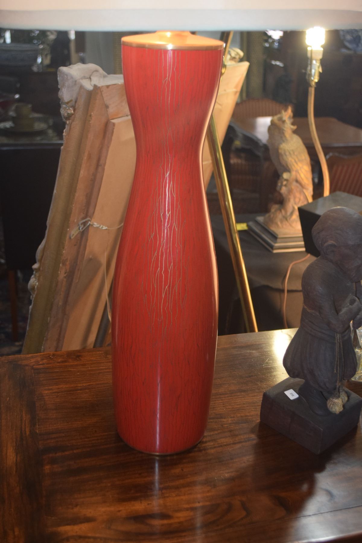 PAIR CINNABAR RED ENAMEL BASE TABLE LAMPS MANUFACTURED FOR STEPHEN E. EARLS, SEATTLE, EACH W/IVORY SILK SHADE (32")