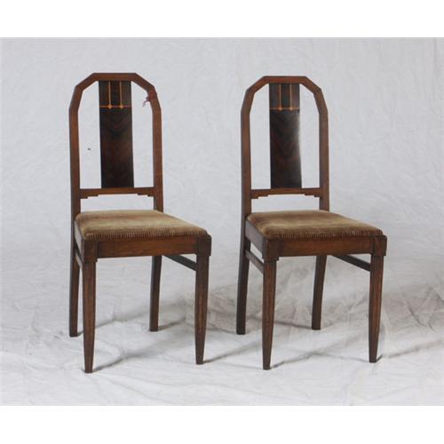 PAIR SIDE CHAIRS: Pair circa 1930 Belgian Art Deco side chairs, each in oak with rosewood splat with satinwood inlay.