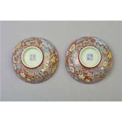 Pair beautifully Famille Rose enameled and gilt, Chinese porcelain bowls with delicate floral designs on deep coral-red grounds, turquoise interiors (some wear to gilt on rims), Yung Cheng seal marks but early 19th Century; D: 5 1/4"