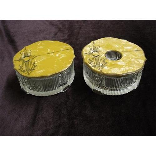 GORGEOUS PAIR OF ART DECO DRESSER JARS, WITH LOVELY CELLULOID TOPS IN CHARTREUSE YELLOW WITH BLACK ART DECO DESIGNS,ONE IS HAIR RECEIVER,Excellent condition, Free from chips or cracks, Each measures about 3 3/4 inch in diam. x 1 3/4 high, US Buyer to pay 8.50 for shipping plus insurance.THANKS.