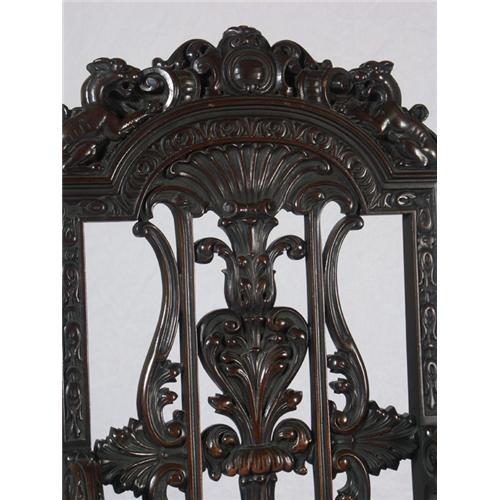 PAIR ARMCHAIRS AND OTTOMAN: Pair English Baroque in the style of Daniel Marot walnut highback armchairs and ottoman, each chair is heavily carved with lions, flowers and acanthus leaves.