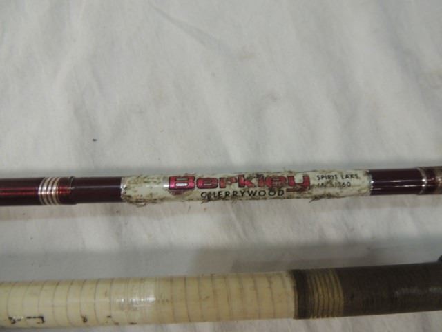 NICE PAIR OF VINTAGE FISHING RODS. SHAKESPEARE WONDEROD IN FIBERGLASS WITH CORK HANDLE, AND BERKLEY CHERRYWOOD GRAPHITE ROD. BOTH WITH CORK HANDLES.