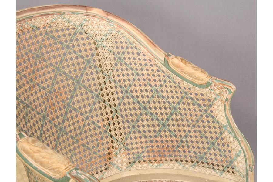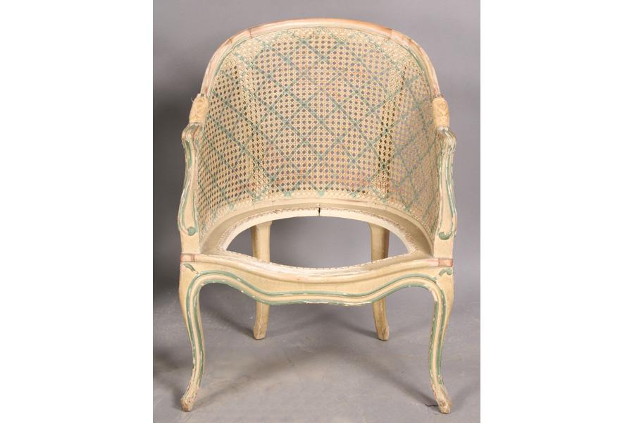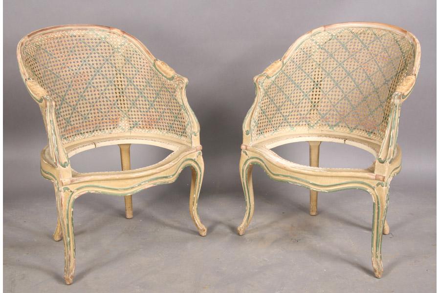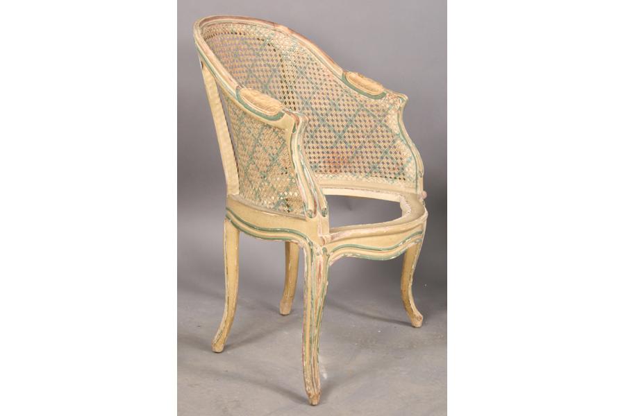 Pair of French bergere chairs with carved and paint decorated frames circa 1940. Having caned back with trellis pattern design. Ht: 33" Width: 24" Depth: 16" ***PLEASE NOTE: All property shall be paid for by the purchaser within five (5) business days of the sale. Kamelot Auctions accepts cash (In house only), personal checks, certified checks and money orders. We do not accept credit cards or Paypal under any circumstances. Please note our policy regarding payments from International buyers: The only acceptable method of payment is a bank wire/bank transfer. For invoices more than $1000, there is no additional fee for this service. For invoices less than $1000, please include an additional $25 wire fee. We will be happy to forward our bank wiring information after the completion of the auction. Thank you for your understanding and cooperation. All purchases must be removed within 15 business days after an auction. Property not removed from our facility after 15 business days will be moved to an off-site storage facility at a charge of $10.00 per day payable by the buyer. Kamelot does NOT provide shipping services or estimates. However, we recommend the following independent shipping services: Antique Transport Co. at antiquetransport@cs.com, Farren Transport at farrentransport@comcast.net or All Points Shipping at jb@allpointsshippingnj.com for quotations and shipping arrangements for furniture and other large items that would require a blanket wrap shipping company. For quotations and shipping arrangements for smaller items that would traditionally be shipped through UPS, please contact The UPS Store at store4744@theupsstore.com or The Packaging Store at hrpa112@aol.com. Clients are welcome to pick up their items from our location or make their own shipping arrangements.