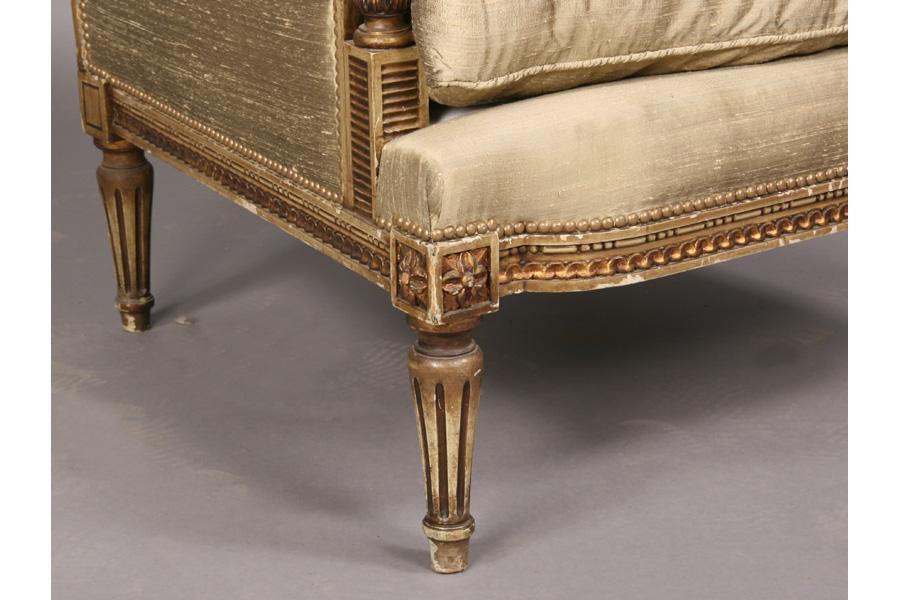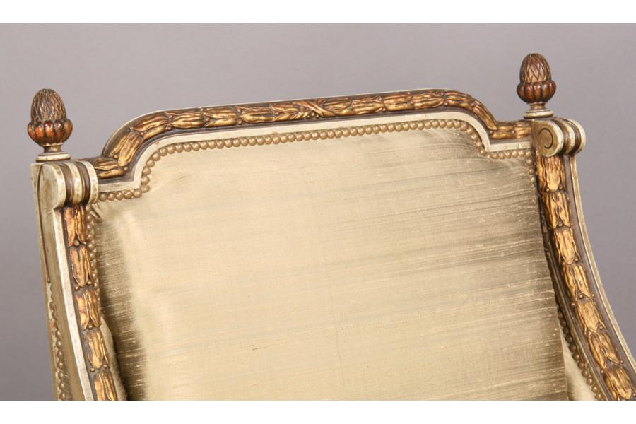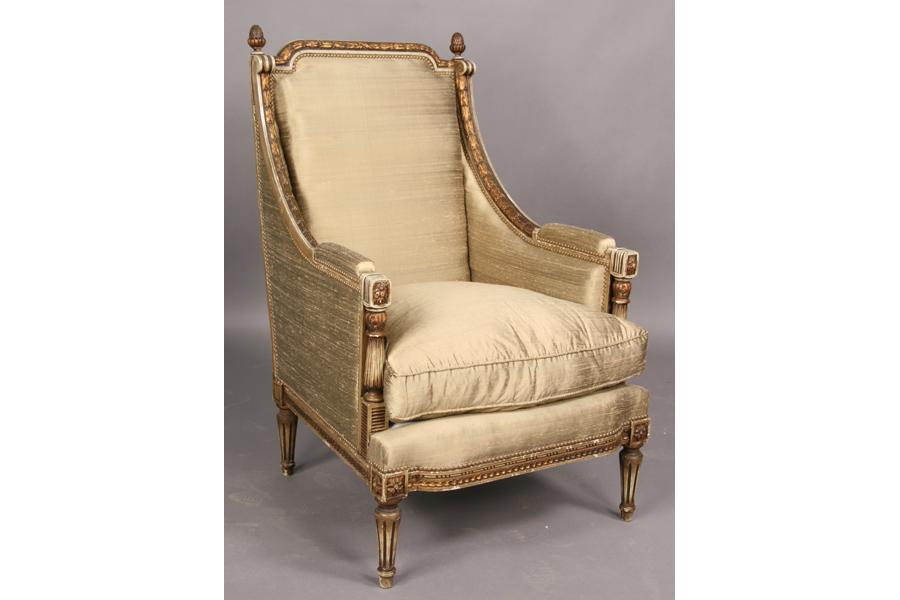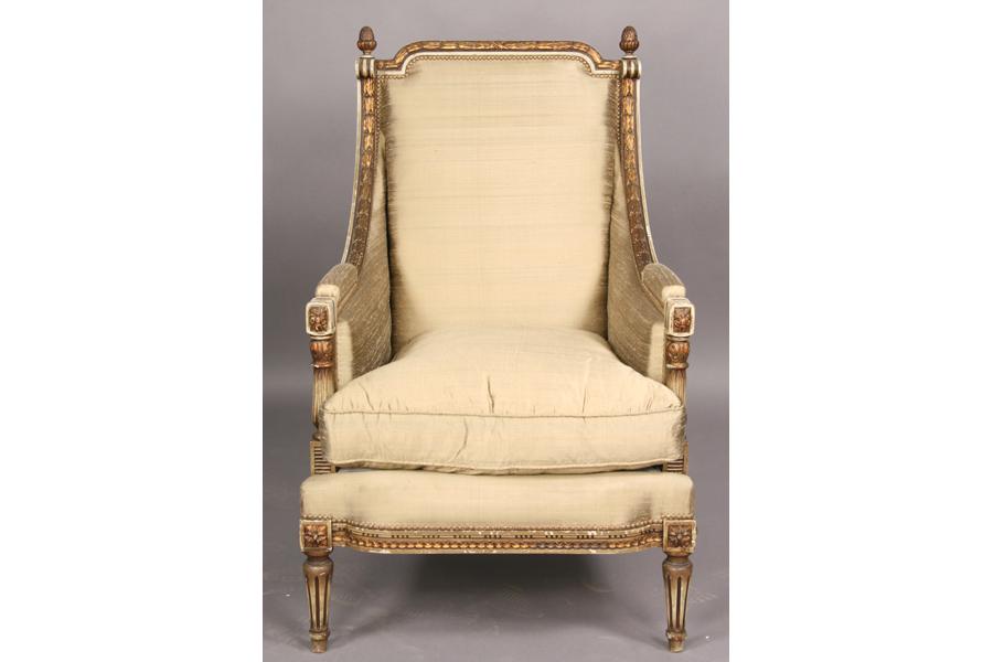 Good pair of well proportional French Louis XVI style giltwood carved and paint decorated bergere chairs circa 1920. Having acanthus garland carved trim and downswept arms on open column supports. Raised on tapered and fluted legs. Ht: 42" Width: 27" Depth: 26" ***PLEASE NOTE: All property shall be paid for by the purchaser within five (5) business days of the sale. Kamelot Auctions accepts cash (In house only), personal checks, certified checks and money orders. We do not accept credit cards or Paypal under any circumstances. Please note our policy regarding payments from International buyers: The only acceptable method of payment is a bank wire/bank transfer. For invoices more than $1000, there is no additional fee for this service. For invoices less than $1000, please include an additional $25 wire fee. We will be happy to forward our bank wiring information after the completion of the auction. Thank you for your understanding and cooperation. All purchases must be removed within 15 business days after an auction. Property not removed from our facility after 15 business days will be moved to an off-site storage facility at a charge of $10.00 per day payable by the buyer. Kamelot does NOT provide shipping services or estimates. However, we recommend the following independent shipping services: Antique Transport Co. at antiquetransport@cs.com, Farren Transport at farrentransport@comcast.net or All Points Shipping at jb@allpointsshippingnj.com for quotations and shipping arrangements for furniture and other large items that would require a blanket wrap shipping company. For quotations and shipping arrangements for smaller items that would traditionally be shipped through UPS, please contact The UPS Store at store4744@theupsstore.com or The Packaging Store at hrpa112@aol.com. Clients are welcome to pick up their items from our location or make their own shipping arrangements.