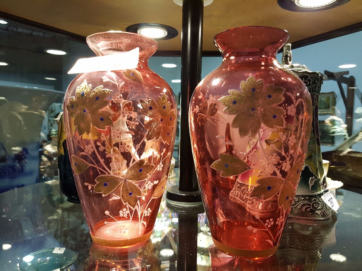 PAIR HAND PAINTED CRANBERRY GLASS VASES