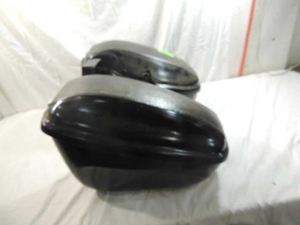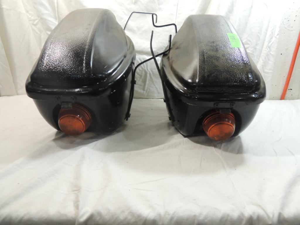 MOTORCYCLE SIDE BOXES, HARD CASE LOCKING SIDE BOXES WITH BREAK LIGHTS, HONDA? HARLEY DAVIDSON? BLACK SIDE BOXES MOTORCYCLE ACCESSORIES AS SHOWN SEE PHOTO FOR MORE DETAILS.