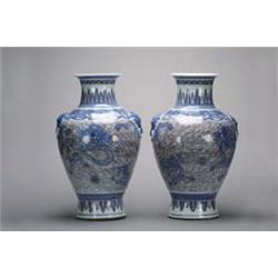 Pair of very large and elaborately detailed, antique Chinese underglaze blue and white with copper-red porcelain vases, both with ferocious five-claw dragons amid waves, bordered by plantain, lotus and diapered bands, animal-head and mock rings at shoulders, 19th C. (rim repair to one and chips to both); both H: 5 1/4"