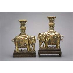 Pair of large, antique and very elaborately detailed, Chinese silver-gilt vases as elephants with ku-form vessels on their backs; repousse dragons, animal mask and Buddhist symbols, white jade tusks and loose rings; both H: 17 1/4" (small loss to one), ivory and wood stands (some flaws), late 19th Century