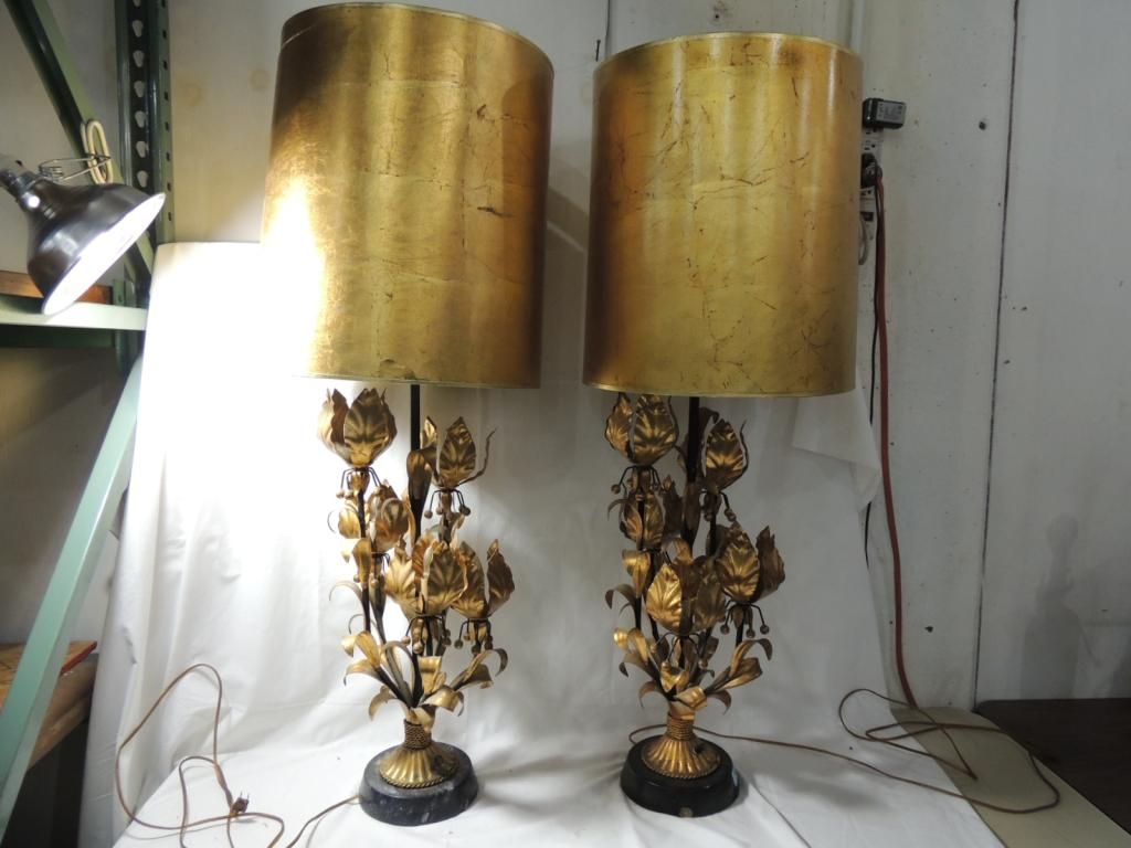 PAIR LARGE VITNAGE HOLLYWOOD REGENCY. OLD HOLLYWOOD GLAMOUR GOLD FLOWER LAMP. 5 FLOWERS WITH SMALL BULB ON DIMMERS AND LARGE GOLD SHADE. ASS SHOWN. SEE PHOTO FOR MORE DETAILS.