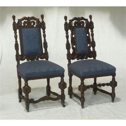 PAIR SIDE CHAIRS: Pair late 19th century William and Mary style walnut side chairs, each with carved frame and blue floral brocaded seat and back.