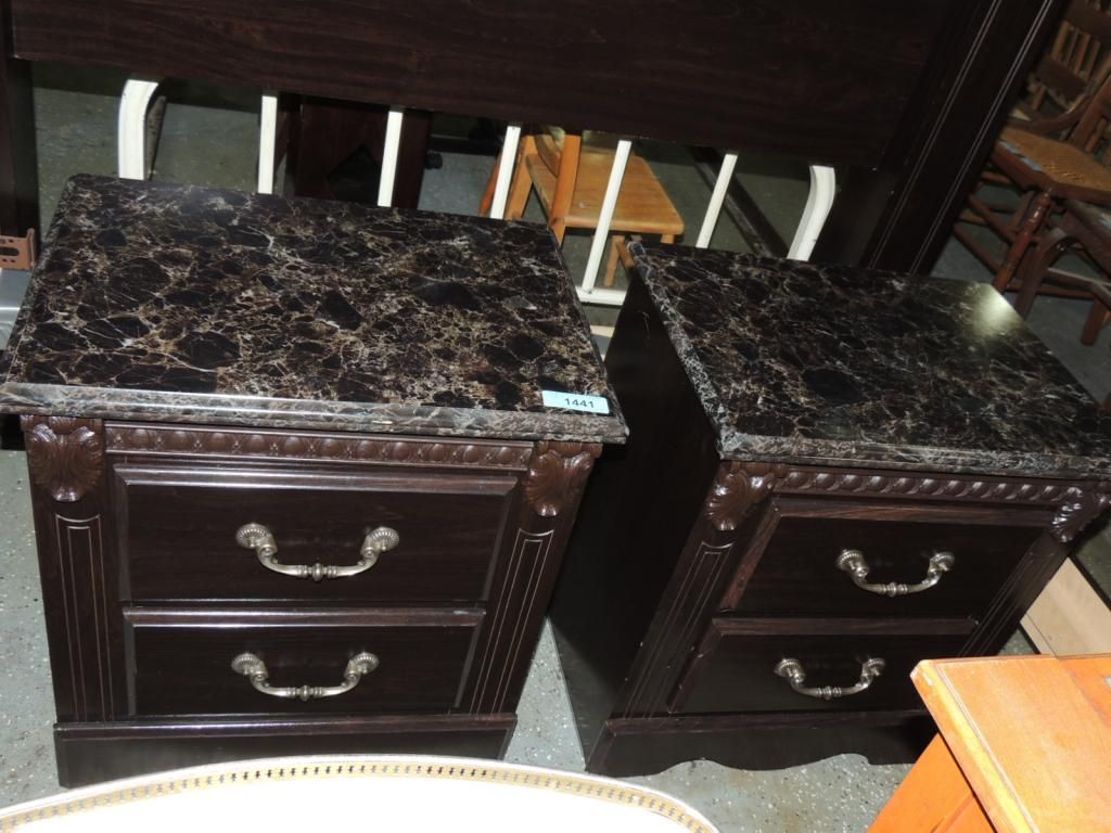 PAIR MODERN 2 DRAWER BEDSIDE TABLE DARK WOOD DETAILS AND MARBLE LIKE TOP. AS SHOWN. SEE PHOTO FOR MORE DETAILS.
