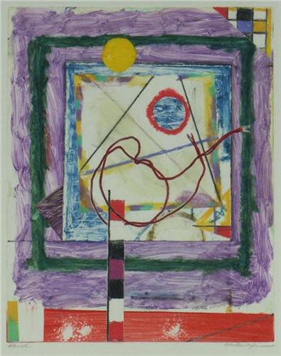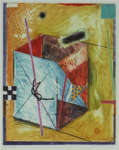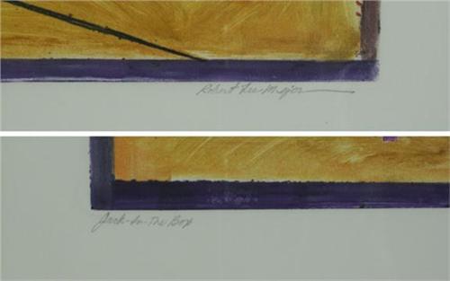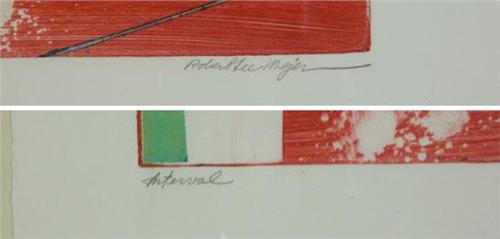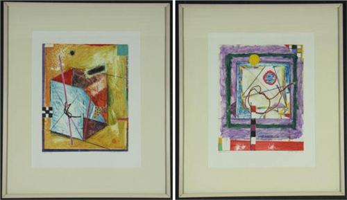 PAIR OF MONOPRINTS 22'' x 17 1/2'', Robert Lee Mejer (1944-), Illinois. ''Jack in the Box'' & ''Interval''. Signed lower right. Laid on fabric backing and placed in cream-colored metal frames. Mejer is a painter, printmaker and Professor of Art at Quincy University in Illinois. More info. in the white binder.