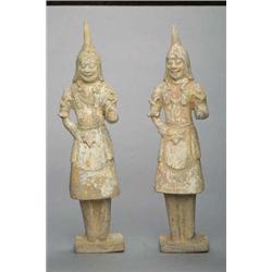 Pair of tall and well-modeled, Chinese Northern Ch'i Dynasty, painted pottery figures of standing grooms/guards with expressive facial features and wearing prominent hats with high spiked protrusions (both with small repairs and one with left arm re-stuck); H: 23" and 23 1/2"